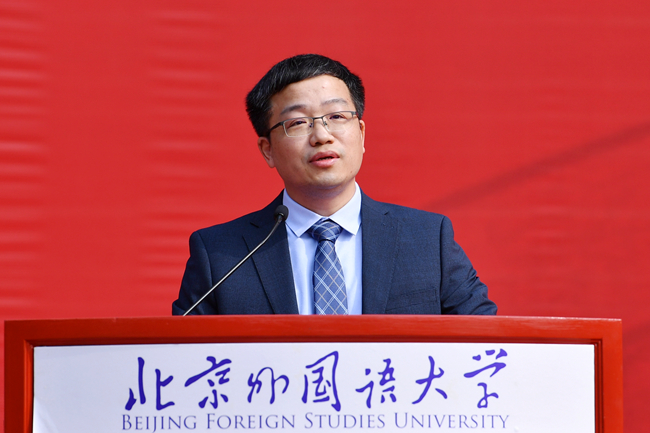 趙志瑾校友祝賀新同學圓夢北外,在致辭中向學弟學妹們提出三點建議:一要學習好,打好堅實的基礎、學以致用;二要堅持認識自我、找到熱愛;三要堅持終生學習,獨立思考。希望新同學度過充實、美好、愉快的大學生活,成為具有中國情懷、國際視野、思辨能力和跨文化能力的復合型、復語型、高層次國際化人才,祝愿北外的明天更加美好輝煌。